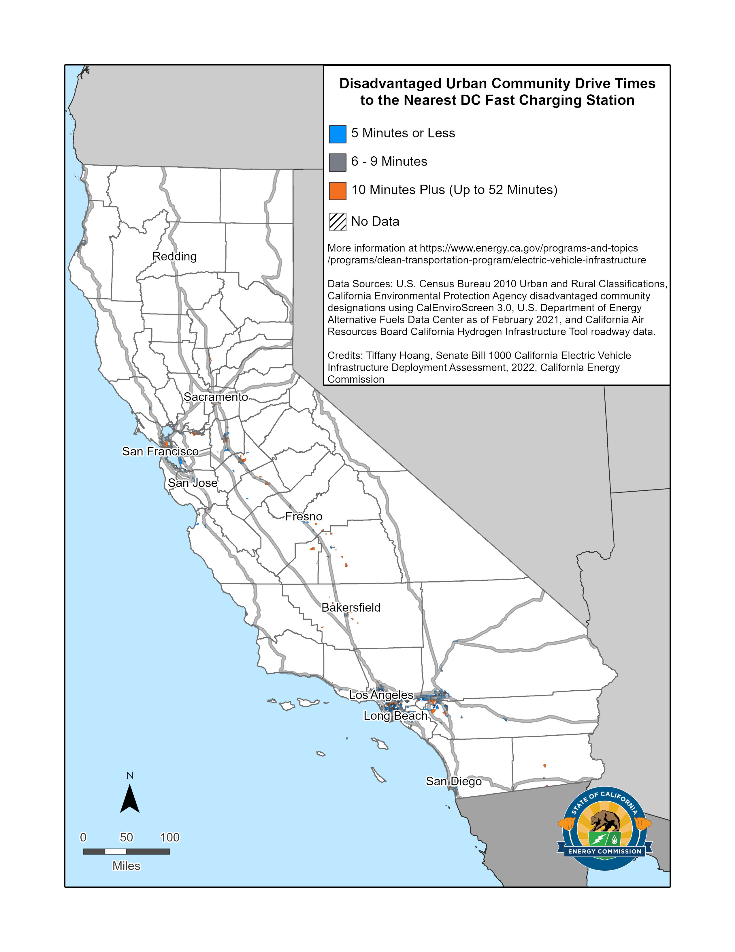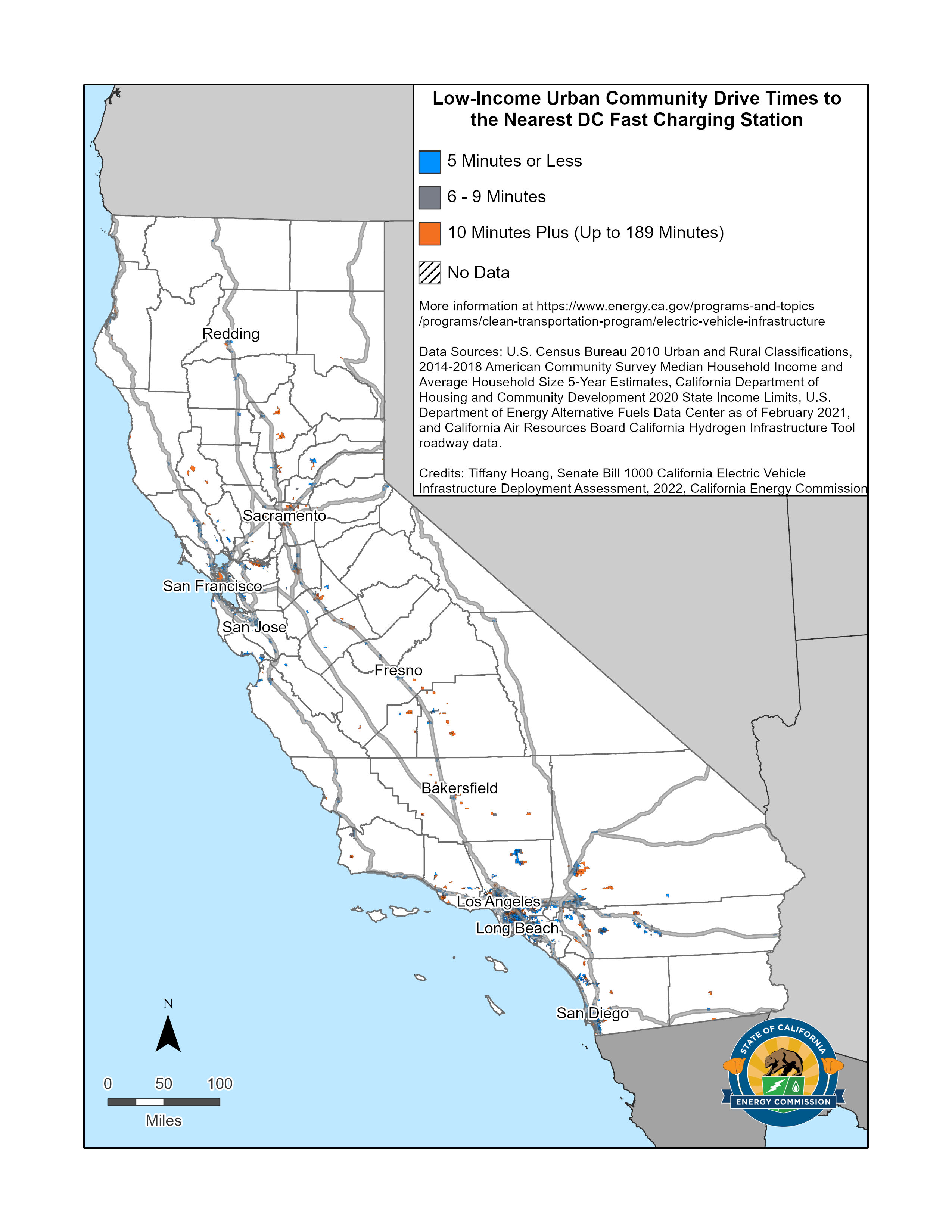 SB 1000 Map of Low-income Urban Community Drive Times to the Nearest DC Fast Charging Station