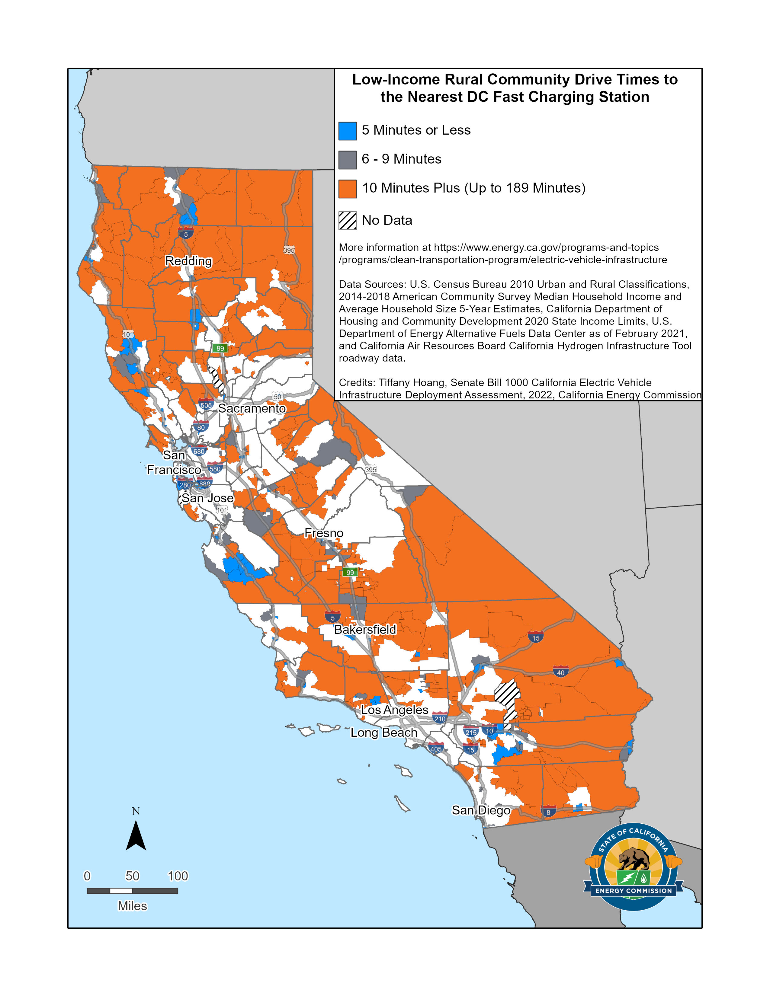 SB 1000 Map of Low-income Rural Community Drive Times to the Nearest DC Fast Charging Station